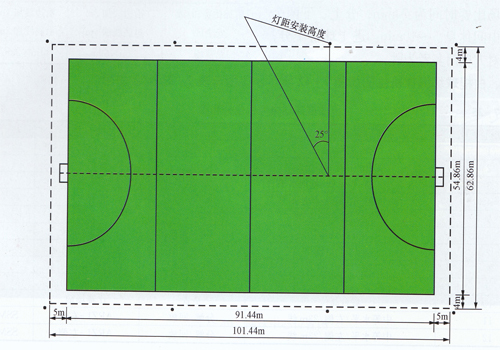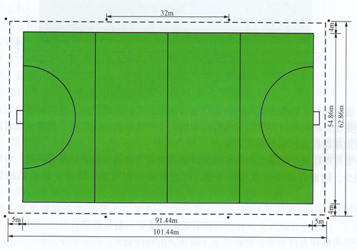 曲棍球場地四周設有無障礙區,在障礙區域內絕對不允許裝設燈桿,燈塔。無障礙區域最小為:距兩底線5m,距兩邊線4m