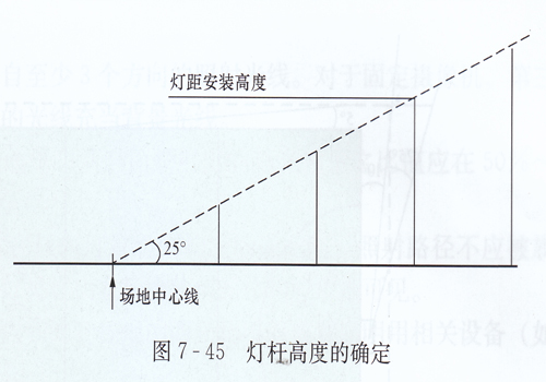 燈桿的高度除與燈具的瞄準角有關,還與燈具到場地的距離有關。燈桿離場地越遠,燈桿就越高。圖7-45描述了它們之間的關系。