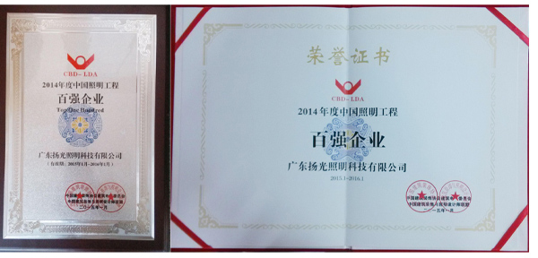 揚(yáng)光照明榮獲“2014年度中國(guó)照明工程百?gòu)?qiáng)企業(yè)”稱(chēng)號(hào)