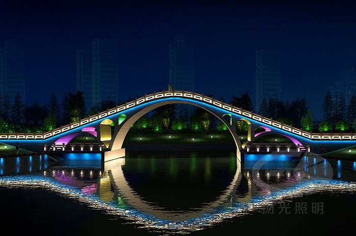 橋底面也要適度地設置照明,以顯示橋的立體感。底面照明時,應使其亮度與橋側面亮度形成適度差別,或在色調上形成一定的變化,以求效果的生動。同時還要考慮橋體照明與周邊園林、城市照明的協調感,不能過于突兀于周邊的景色,造成周邊夜景的失色。