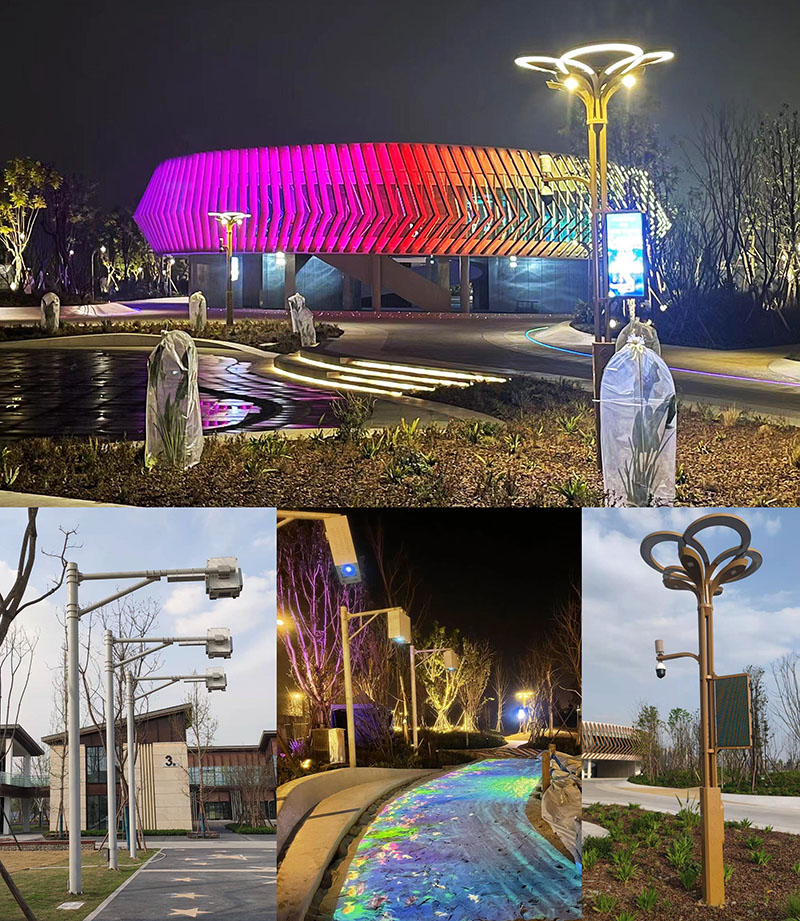 ”智慧城市,智慧照明“在項目中亦多處使用,功能照明上,各地塊均使用非標定制的智慧燈桿,實現園區監控、信息投播、語音廣播、功能照明、WiFi傳播、一鍵報警等一體化智慧科技,智能城市系統化。